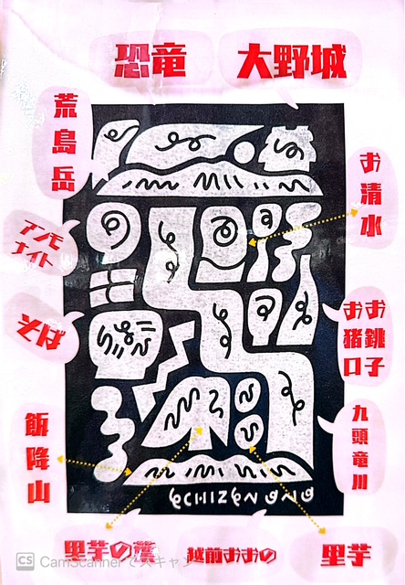 越前大野に関する物をイメージしたイラストが描かれた巾着袋です。